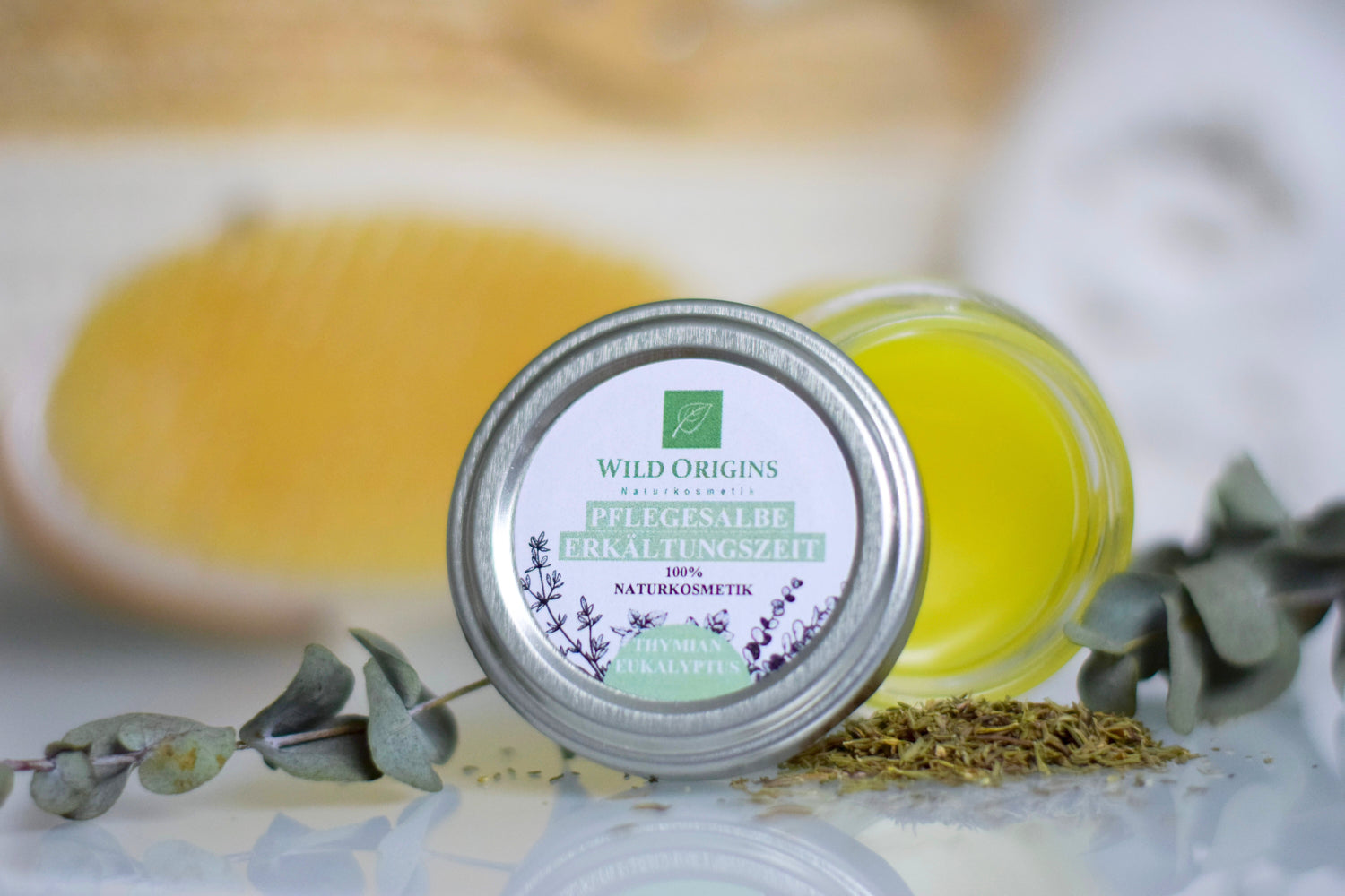 Die Pflegesalbe „Erkältungszeit“ ist eine wohltuende Pflege für die kalte Jahreszeit. Die Kombination aus Eukalyptusblattöl und Thymianextrakt ist für ihren angenehmen Duft bekannt und sorgt für ein entspannendes Gefühl, besonders an kühlen Tagen.